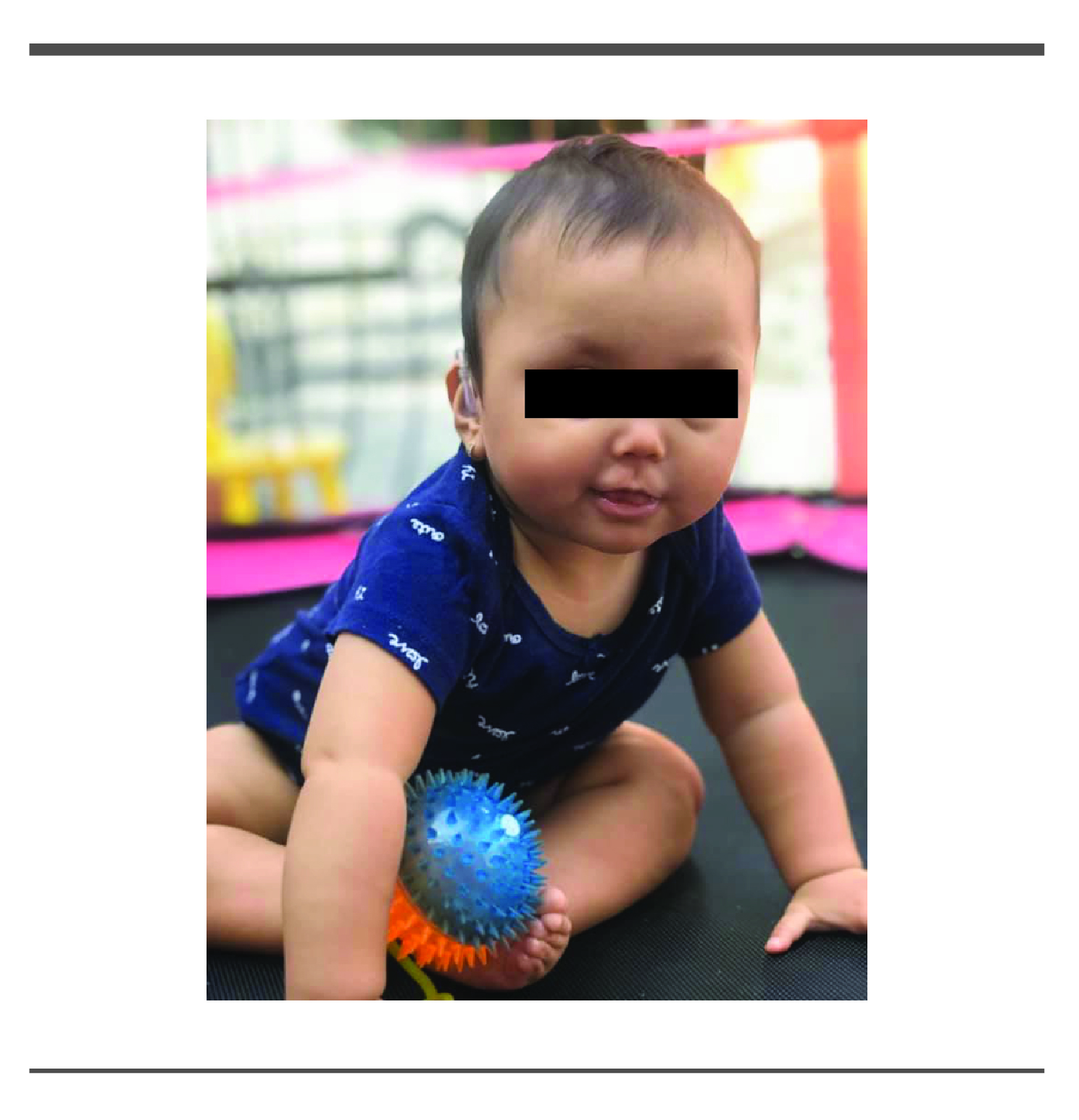Estudios laboratorio y gabinete: Electroencefalograma. Reportado normal; Ultrasonido abdominal sin alteraciones; Ecocardiograma: Reporta comunicación interauricular ostium secundum de 6.9x7x5 mm, presión pulmonar normal; Tamiz auditivo: reportan hipoacusia profunda bilateral; PEA: hipoacusia derecha severa a profunda, izquierda severa; TAC de oídos que reporta disgenesia de membranas timpánicas y martillo. Impedanciometría otitis media serosa bilateral