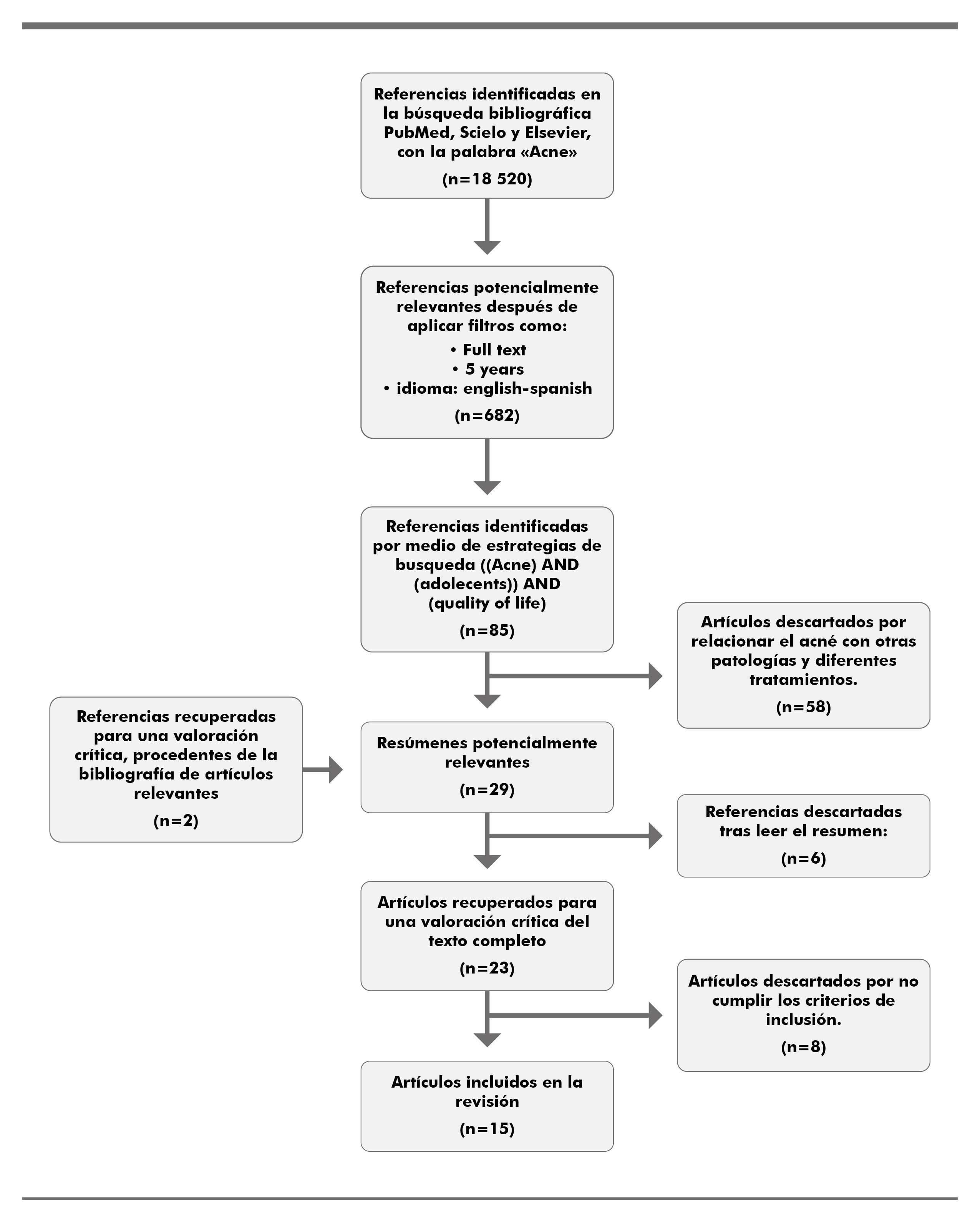 Se realizó una búsqueda bibliográfica en la base de datos PubMed con las palabras claves acné, adolescente y calidad de vida, se incluyeron estudios prospectivos, observacionales, así como revisiones sistemáticas y metaanálisis relacionados con los estudios realizados con la calidad de vida en pacientes con acné.