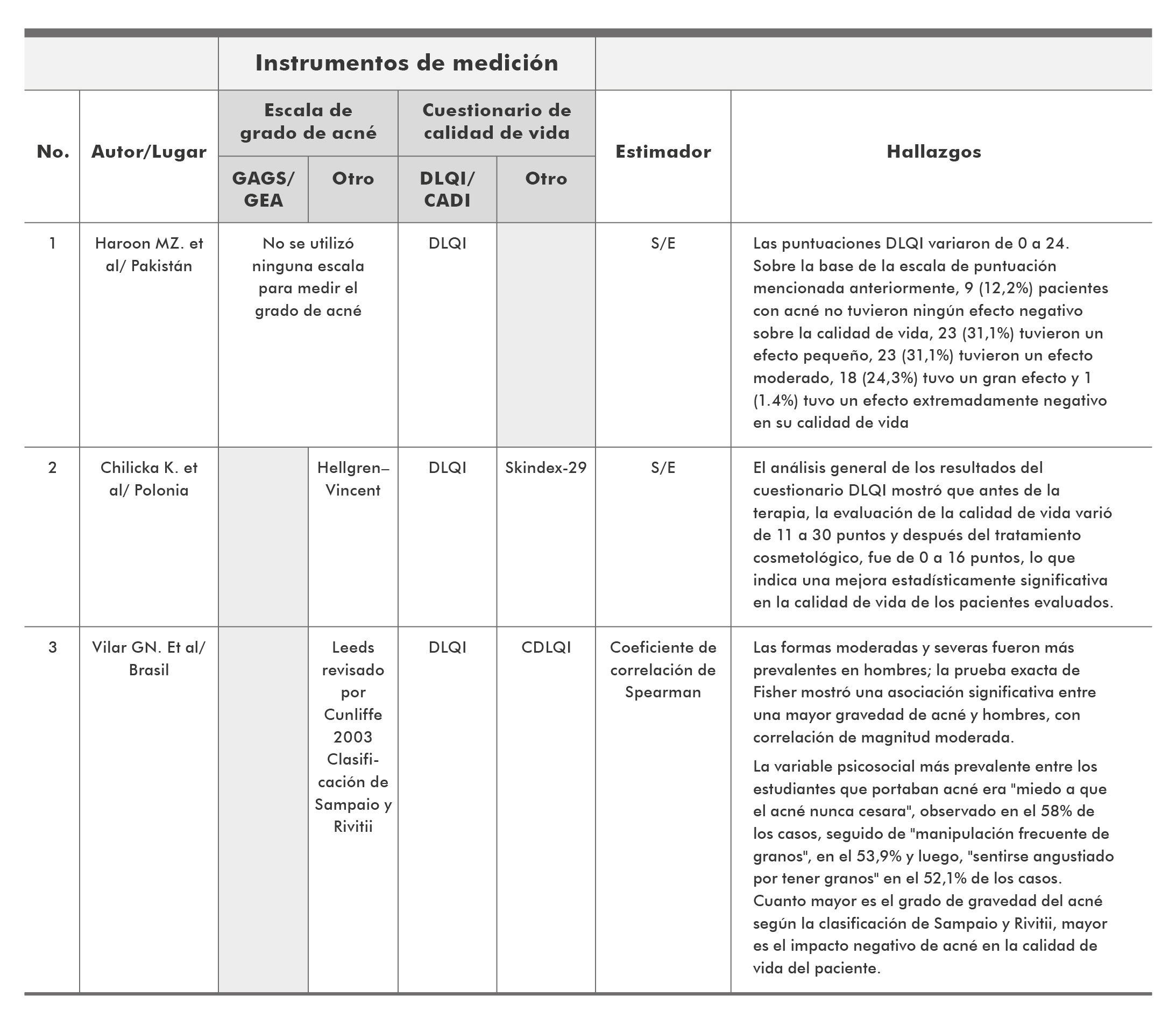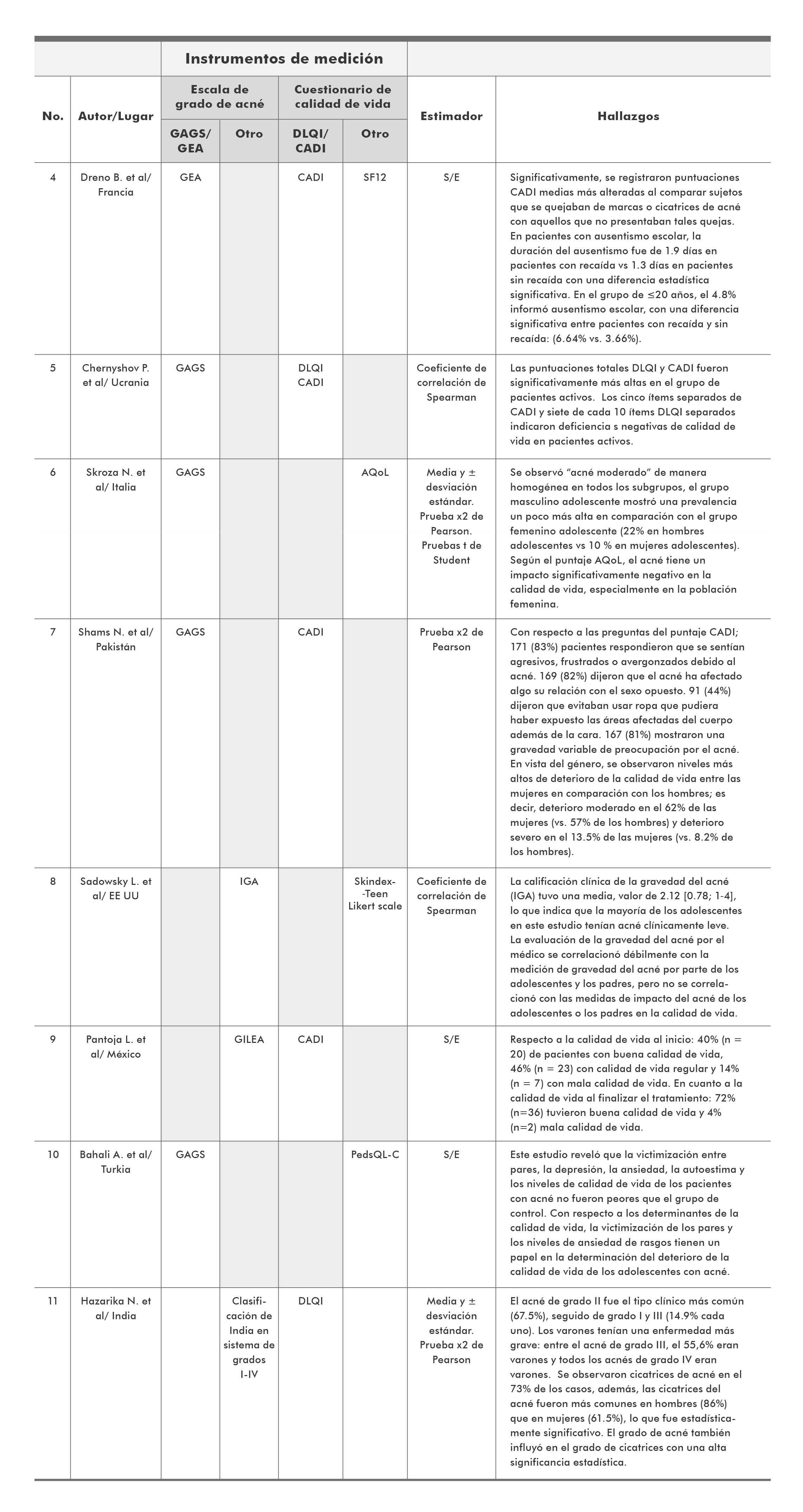 Tabla 3. Acné y calidad de vida en adolescentes. Artículos incluidos en la revisión.