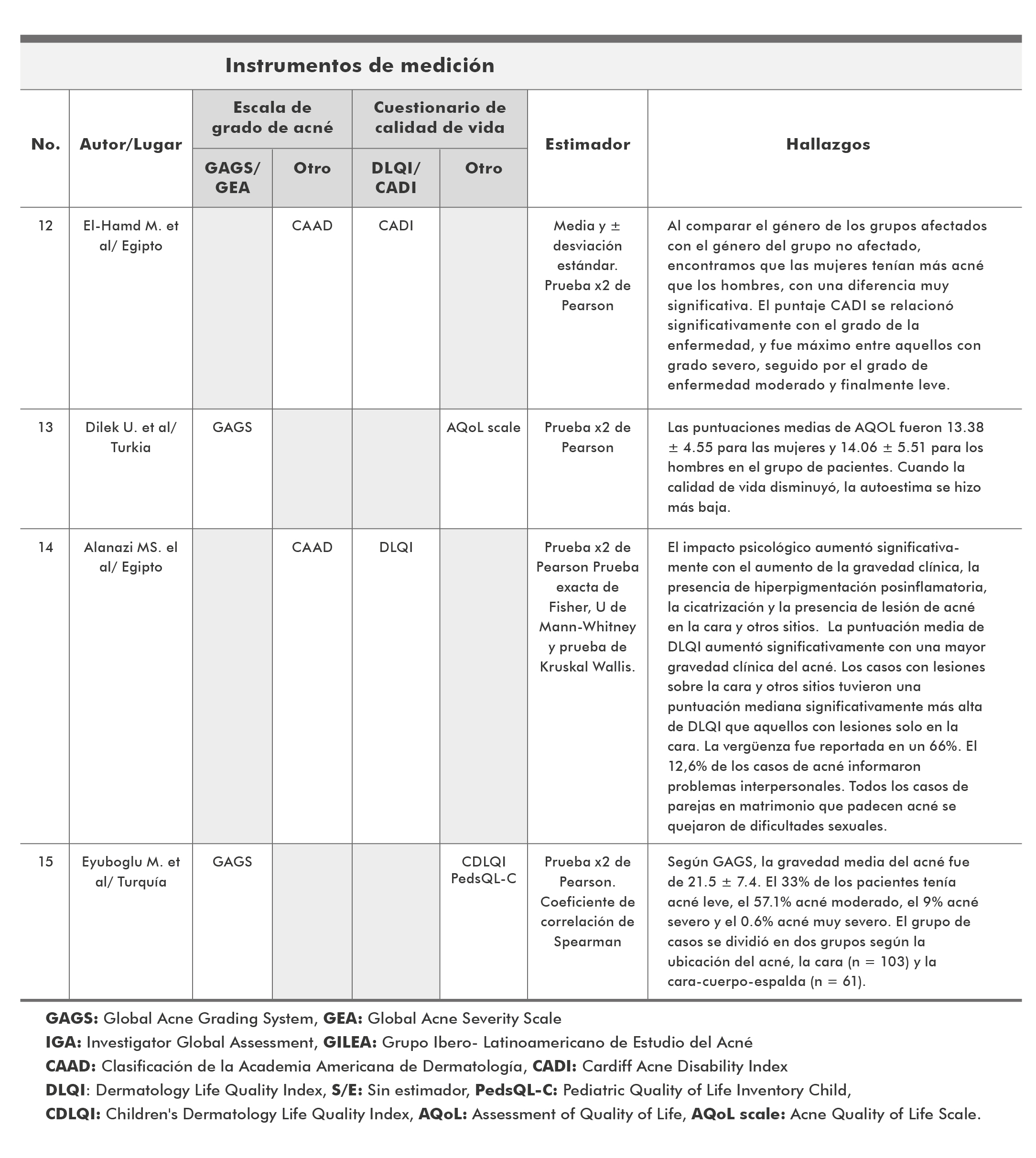 En cuanto al uso de las escalas de clasificación de severidad del acné, se encontró que 46.6% de los artículos incluidos utilizaron GAGS y GEA, y el resto (53.3%) utilizó otras escalas.
