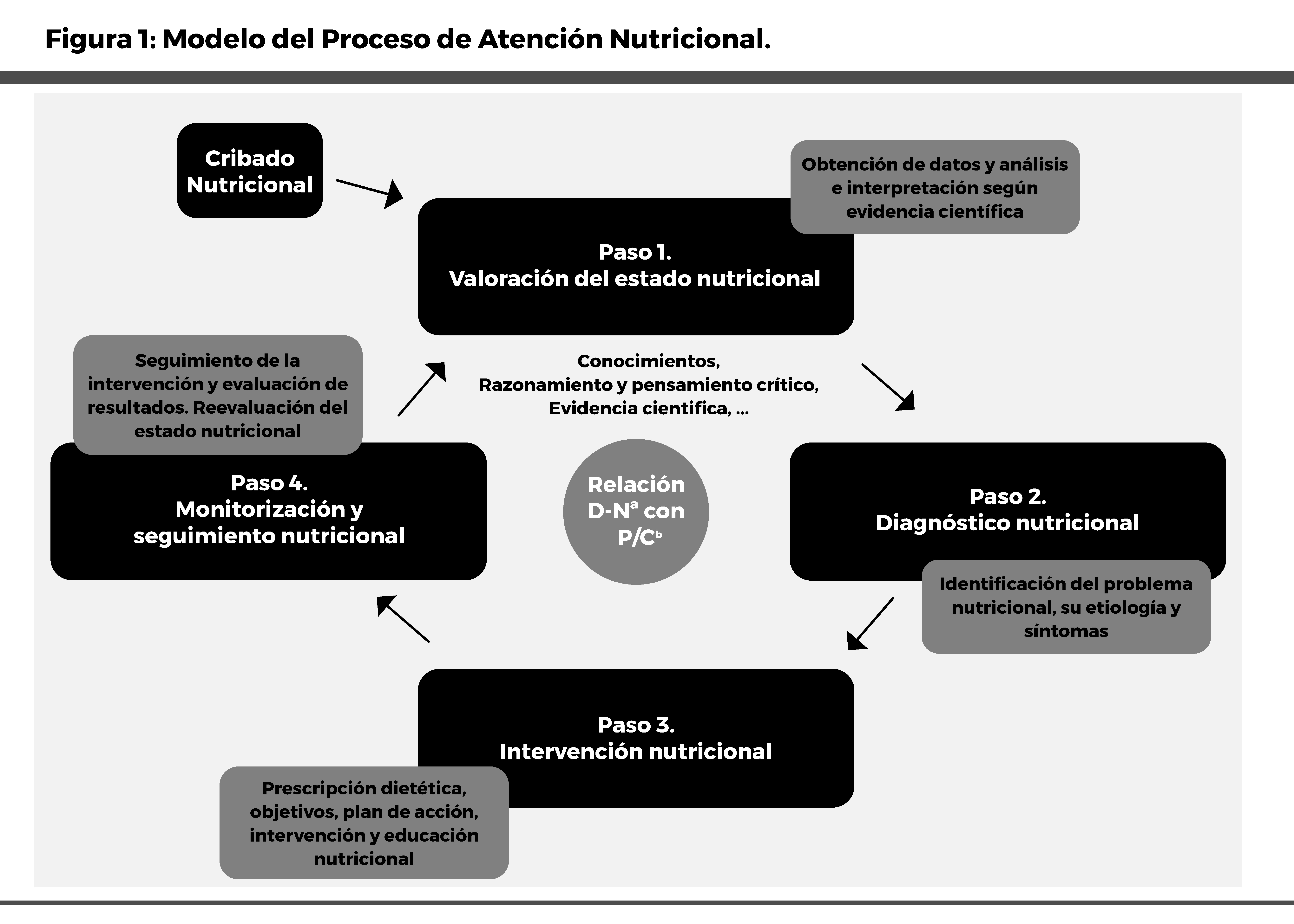 Cuarto paso: Monitorización y seguimiento nutricional. Se valora la evolución del paciente y el cumplimiento de la intervención nutricional oral. La repercusión en el estado nutricional se reevalúa y se compara con la información recogida en la valoración inicial, mediante indicadores que reflejen cambios, tales como la modificación de hábitos alimentarios, variaciones en el peso corporal, cambios en la composición corporal y parámetros bioquímicos, entre otros. Este último paso forma parte de un proceso dinámico y cíclico que permite evaluar los resultados, de acuerdo con lo establecido en el Proceso de Atención Nutricional (PAN), así como modificar la intervención nutricional cuando sea necesario o reevaluar nuevamente el estado nutricional. Por ello, esta fase es fundamental para revertir el problema nutricional y prevenir la aparición de complicaciones futuras. Existen diversas causas que pueden conducir al fracaso de una intervención nutricional; una de las más relevantes es el incumplimiento, por parte del paciente, a la intervención planteada. De ahí la necesidad de implicar activamente al paciente en el proceso. Cada vez que el paciente es reevaluado, se genera un nuevo estado de situación, el cual permite analizar la evolución clínica y nutricional, así como planificar nuevamente la intervención nutricional (6).