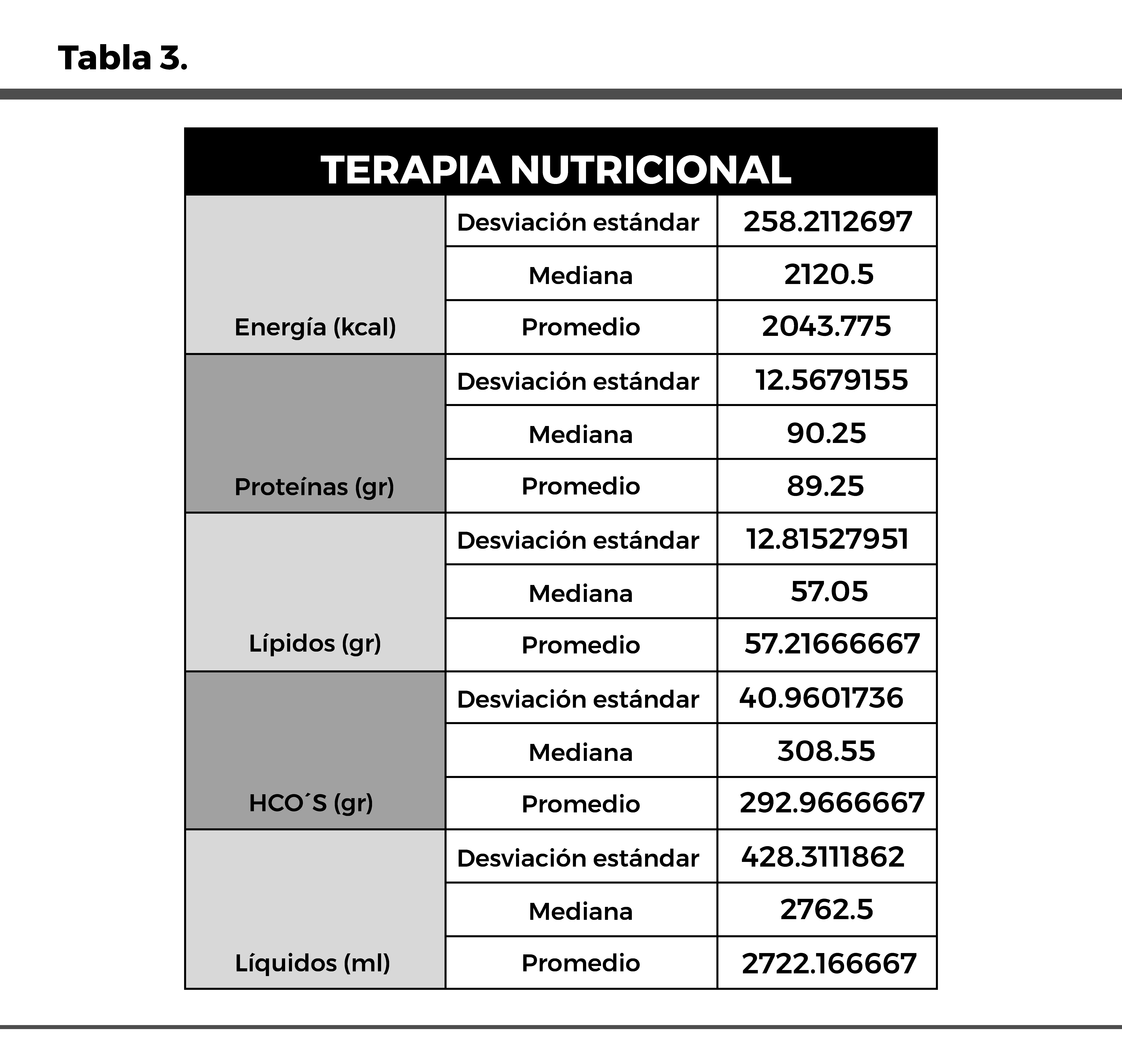 Nota: La tabla presenta los valores promedio, mediana y desviación estándar de la ingesta dietética para la terapia nutricional según las necesidades de los pacientes hospitalizados. Kcal (calorías), Gr (gramos), Ml (mililitros). Elaboración propia.