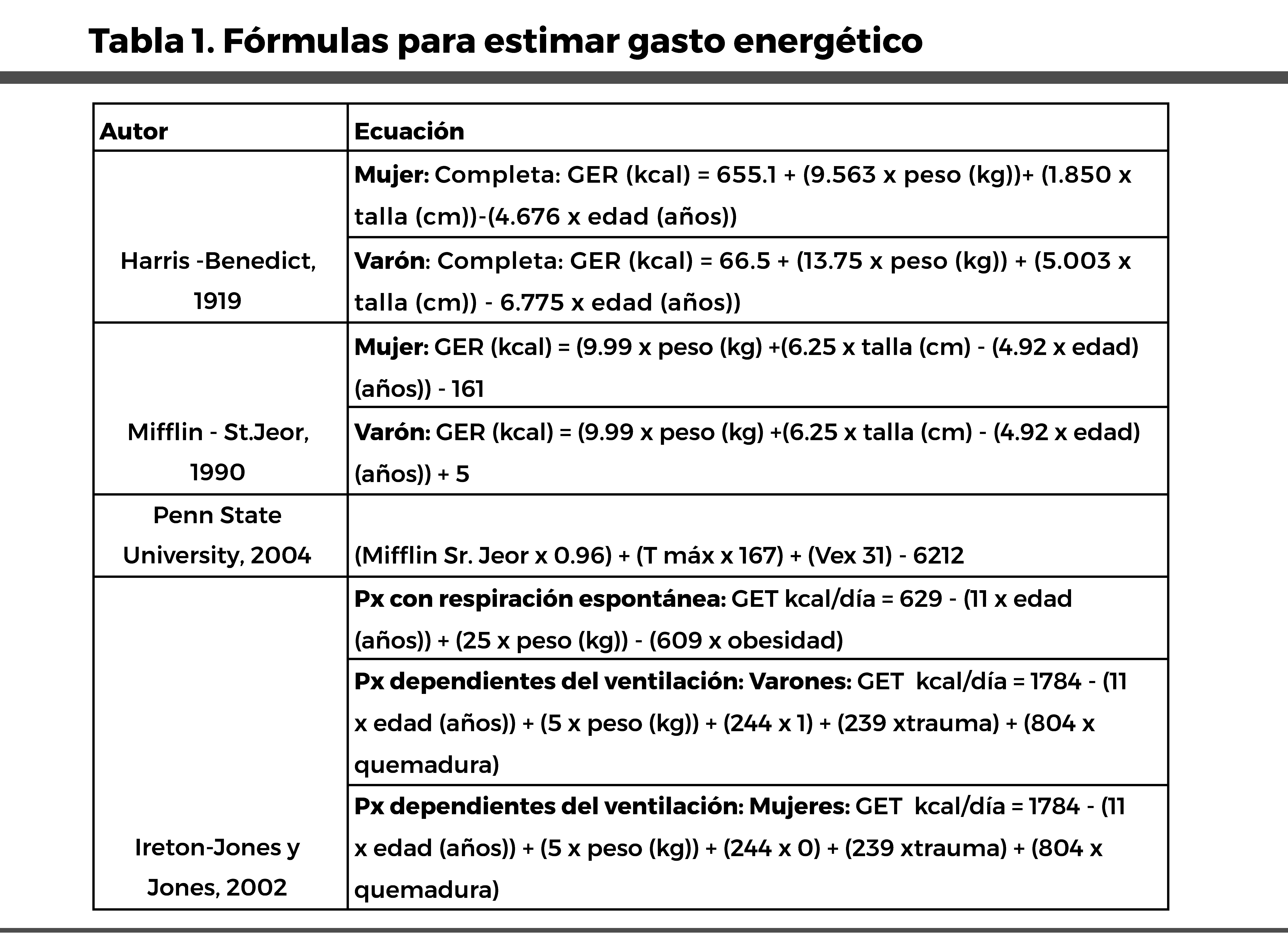 Nota: Fórmulas para estimar el gasto energético. Elaboración propia, febrero 2025.(5)
