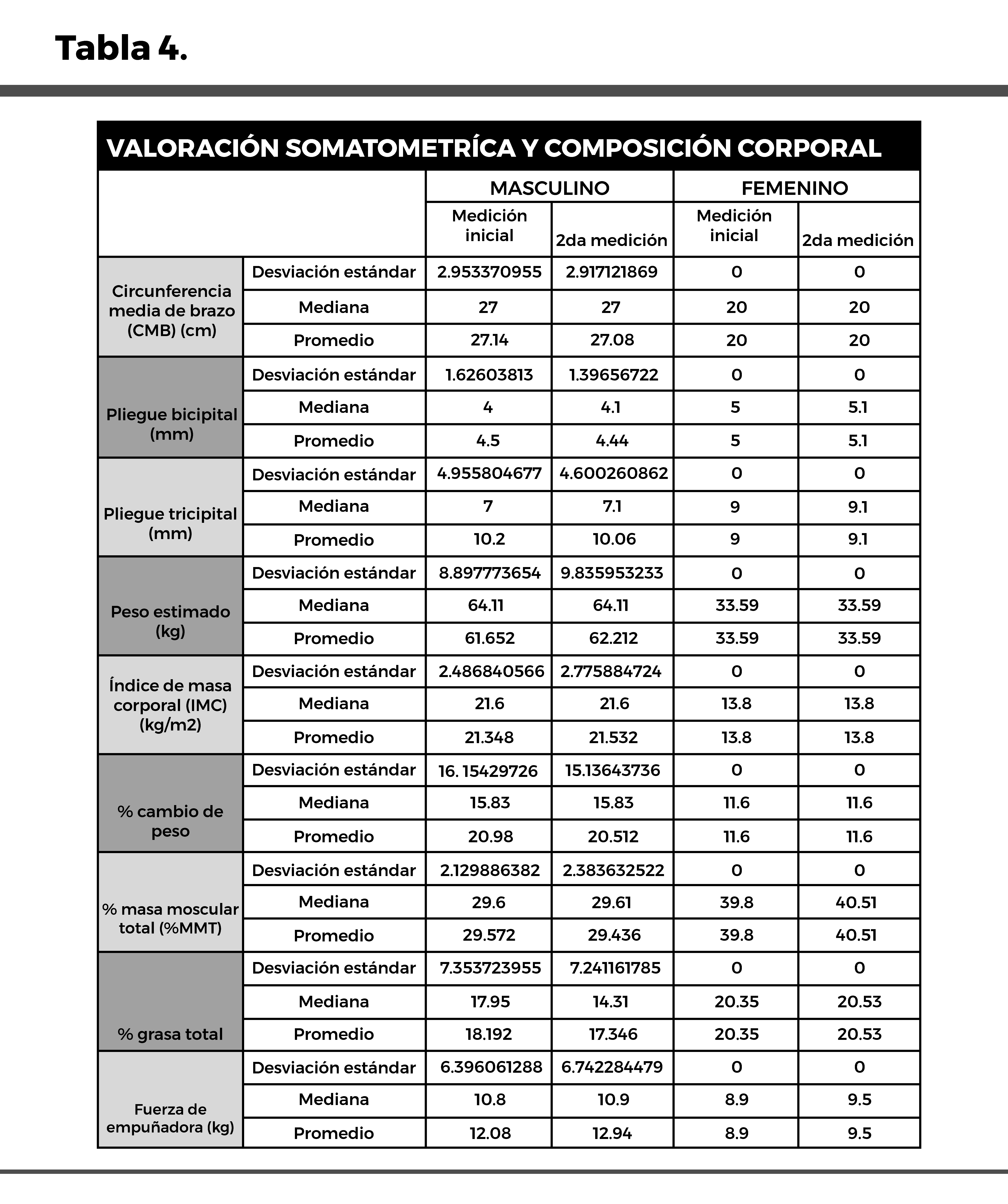 (Tabla 4) permitió observar diferencias importantes entre los grupos masculino y femenino. En general, los pacientes masculinos mostraron cambios discretos pero positivos en su composición corporal y fuerza muscular, mientras que el grupo femenino se mantuvo estable en la mayoría de los indicadores, con mejoras ligeras en algunos parámetros funcionales.