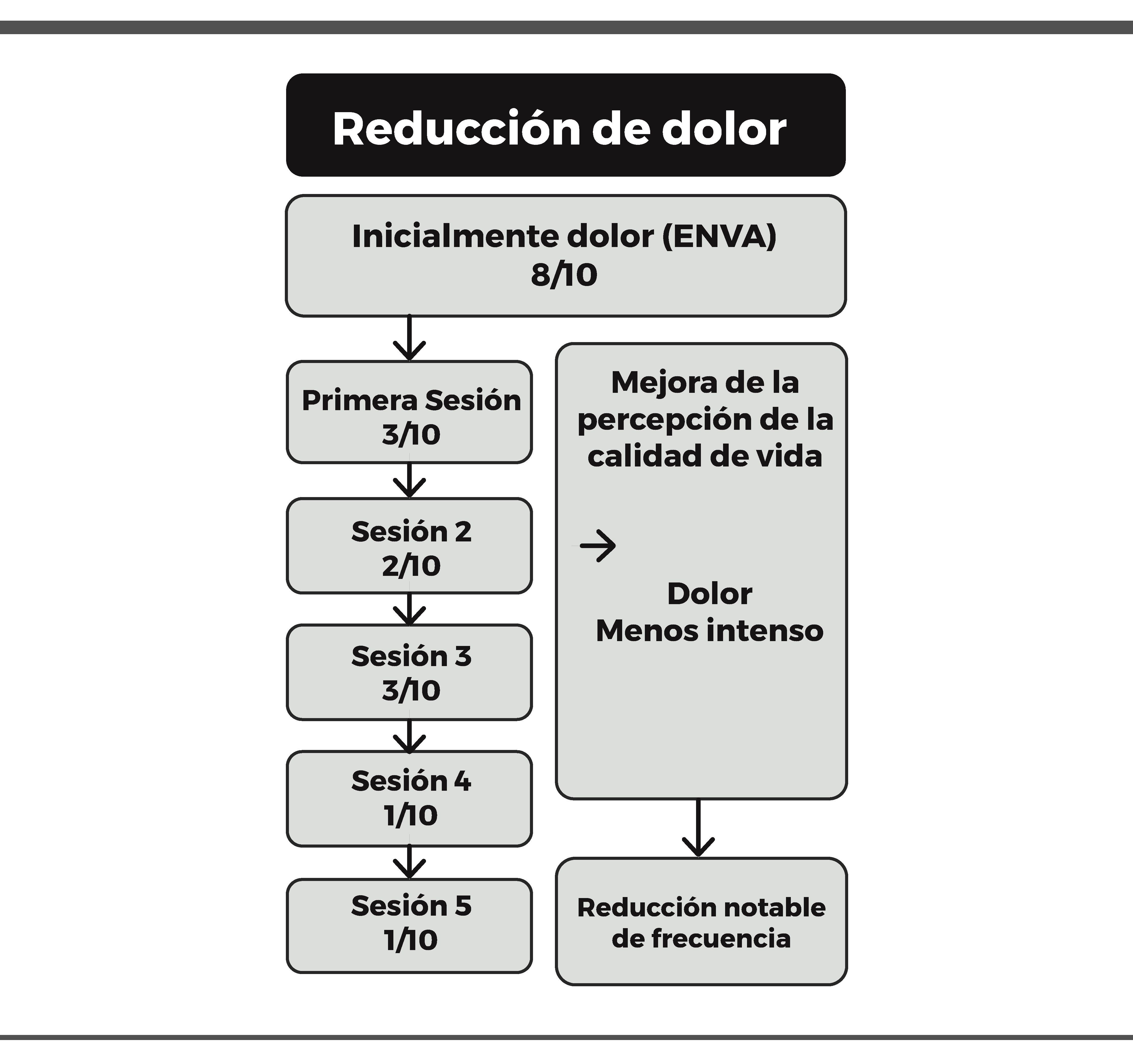 La mejora en la intensidad del dolor, evaluada mediante la Escala Numérica Visual Analógica (ENVA), de 8/10 a 1/10,