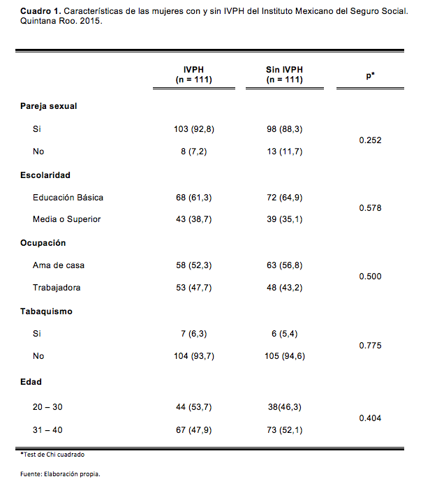 Se incluyeron en el estudio a 222 mujeres (111 con IVPH y 111 sin IVPH) con un promedio de edad de 32.2 años (D.S. ±5.8); la escolaridad predominante en las mujeres de la muestra fue el nivel de secundaria con 37,8%; la ocupación con mayor frecuencia fue el de ama de casa con 54,5%; el 19,0% de las mujeres se realizaban por primera vez el Papanicolaou y 90,5% de las encuestadas tenía una pareja sexual al momento del estudio.