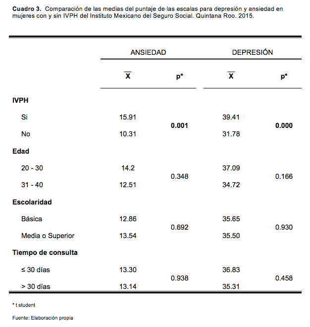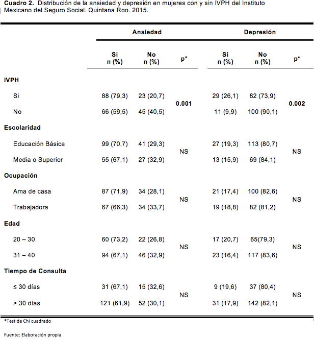 Materials and method. A comparative cross-sectional study with 111 women with a positive Papanicoulaou test to IHPV who were attending the dysplasia clinic of a hospital unit for the first time, and 111 women who were attending the gynecological clinic for the first time and without diagnosis by IVPH, both entitled to the Institute Mexican Social Security (IMSS) in the period from January to July 2015. Calderon and Hamilton's questionnaire was applied for anxiety and depression detection respectively. For the analysis of results, the comparison with the chi-square test was performed, and the prevalence ratio (PR) was estimated.