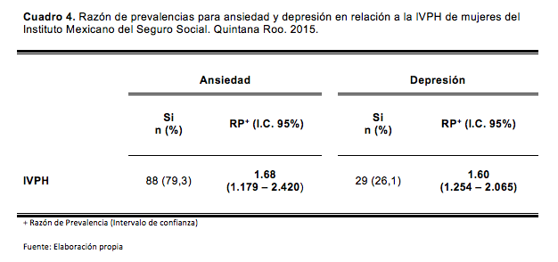 Para depresión y ansiedad, se estimaron frecuencias relativas simples y en relación a la presencia de IVPH, edad y escolaridad. Se utilizó el estadístico de chi cuadrado para determinar las diferencias entre los grupos, t de student para comparación de medias y se estimó la razón de prevalencias (RP) con un intervalo de confianza del 95%.
