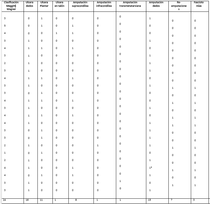 Por lo que respecta a la etiología de la úlcera, estas fueron: úlcera isquémica 8%, úlcera neuropática 16%, y úlcera mixta 76%. En todos los casos las úlceras estaban infectadas. La clasificación de Meggitt-Wagner a su ingreso fue: grado 1 un caso (4.5%), grado 2 tres casos (12%), grado 3 once casos (46%), grado 4 ocho casos (33%) y grado 5 un caso (4.5%); la ubicación de las úlceras fueron: úlceras de artejos 16 (57.5%) casos, úlceras plantares 11 (39%) casos y úlceras en el talón un caso (3.5%).