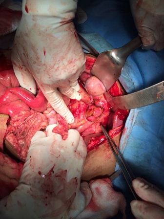 Se integra diagnóstico de perforación de víscera hueca de origen a determinar, y se pasa a quirófano para laparotomía exploratoria, encontrando abundante líquido gastroduodenal libre en cavidad peritoneal con perforación pospilórica completa, caras anterior y posterior con exposición de cabeza del páncreas (Figura 1), así como parasitosis (Áscaris lumbricoides) saliendo a través de la perforación (Figura 2), mismos que son extraídos en su totalidad. (Figura 3)