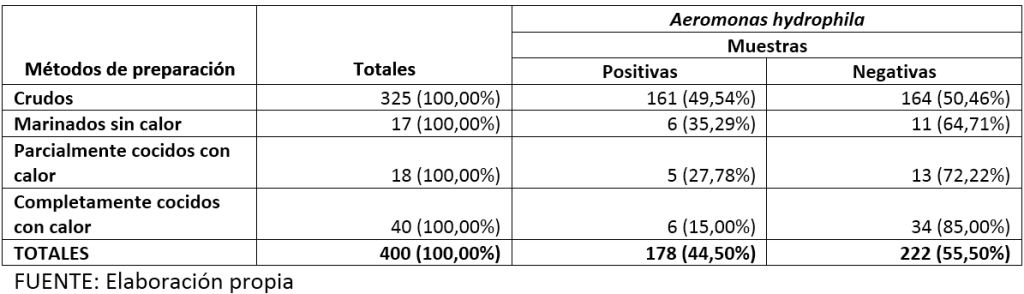 Material and Methods. A descriptive observational cross-sectional study in which four hundred samples were studied. [325 (81,25%) raw, 17 (4,25%) marinated without heat, 18 (4,50%) partially cooked with heat and 40 (10,00%) completely cooked with heat]. For homogenization and enrichment of the samples, as well as for the isolation and identification of Aeromonas hydrophila species proceeded according to the methodology described in the Bacteriological Analytical Manual (Food and Drug Administration). As statistical significance test Chi-square Mantel-Haenszel (x²M-H) was used.
