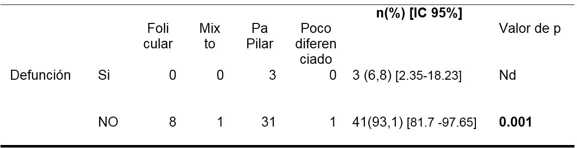 Se presentaron 3 defunciones (6,8%), en una de ellas la causa inmediata fue hemorragia masiva en el postoperatorio mediato; otra por insuficiencia respiratoria a causa de obstrucción de la vía aérea por invasión local; y la tercera por insuficiencia renal por falla orgánica múltiple. Los tres pacientes eran mujeres de 53, 59 y 68 años respectivamente, se encontraban en estadio clínico IVA con tipo histológico papilar (cuadro 6).