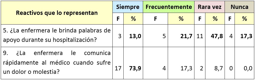 En cuanto al factor comunicación y empatía, los pacientes no lo percibieron siempre en el 100% de los cuidados de enfermería. Al respecto, podría considerarse un problema, dado que no se perciben sentimientos afectivos, siendo esta una de las principales características de la enfermera hacia los pacientes.
