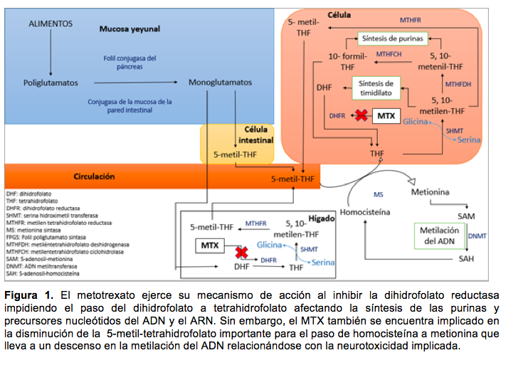 De igual manera, se han descrito distintos mecanismos que intentan explicar la neurotoxicidad asociada a la administración de metotrexato (Figura 1), entre estos se encuentran los siguientes: