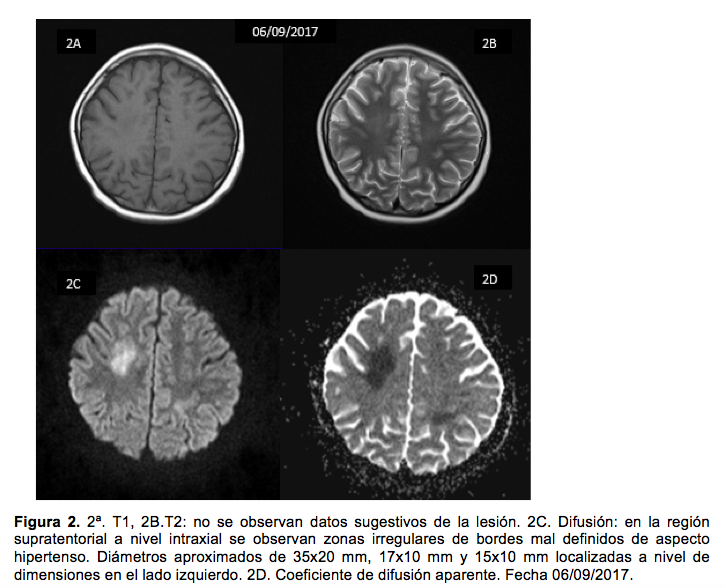 Se inició tratamiento antibacteriano empírico con ceftriaxona y amikacina. Al quinto día de inicio de quimioterapia presentó episodio de temblor sin pérdida del estado de alerta, el cual cedió espontáneamente. Siete días después del inicio del metotrexato presentó un episodio de agitación psicomotriz con clonus del hemicuerpo derecho, sin deterioro del estado de alerta, por lo que se solicitó tomografía computarizada simple y contrastada de cráneo, para descartar lesión estructural orgánica, así como glucosa y electrolitos séricos en búsqueda de alteración metabólica. Los resultados de dichos estudios se encontraron sin alteraciones. Horas más tarde la paciente evolucionó con hemiparesia izquierda, signo de Babinsky positivo bilateral y parálisis facial central izquierda con disfagia y disartria.
