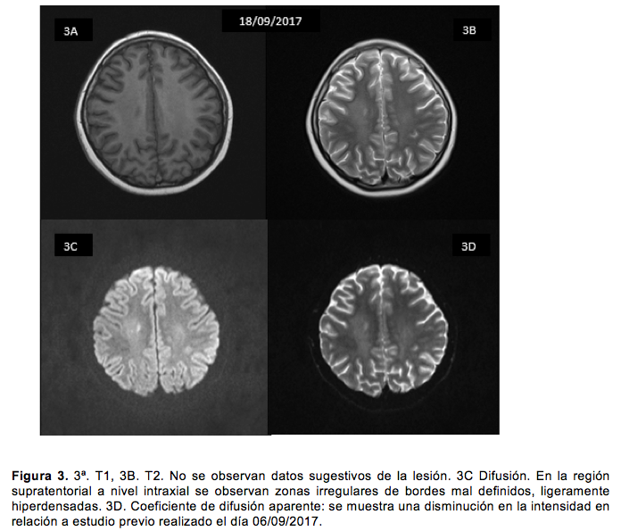 Al vigésimo día se pidió resonancia magnética de control, que mostró mejoría en comparación a los hallazgos de la primera (figura 3).