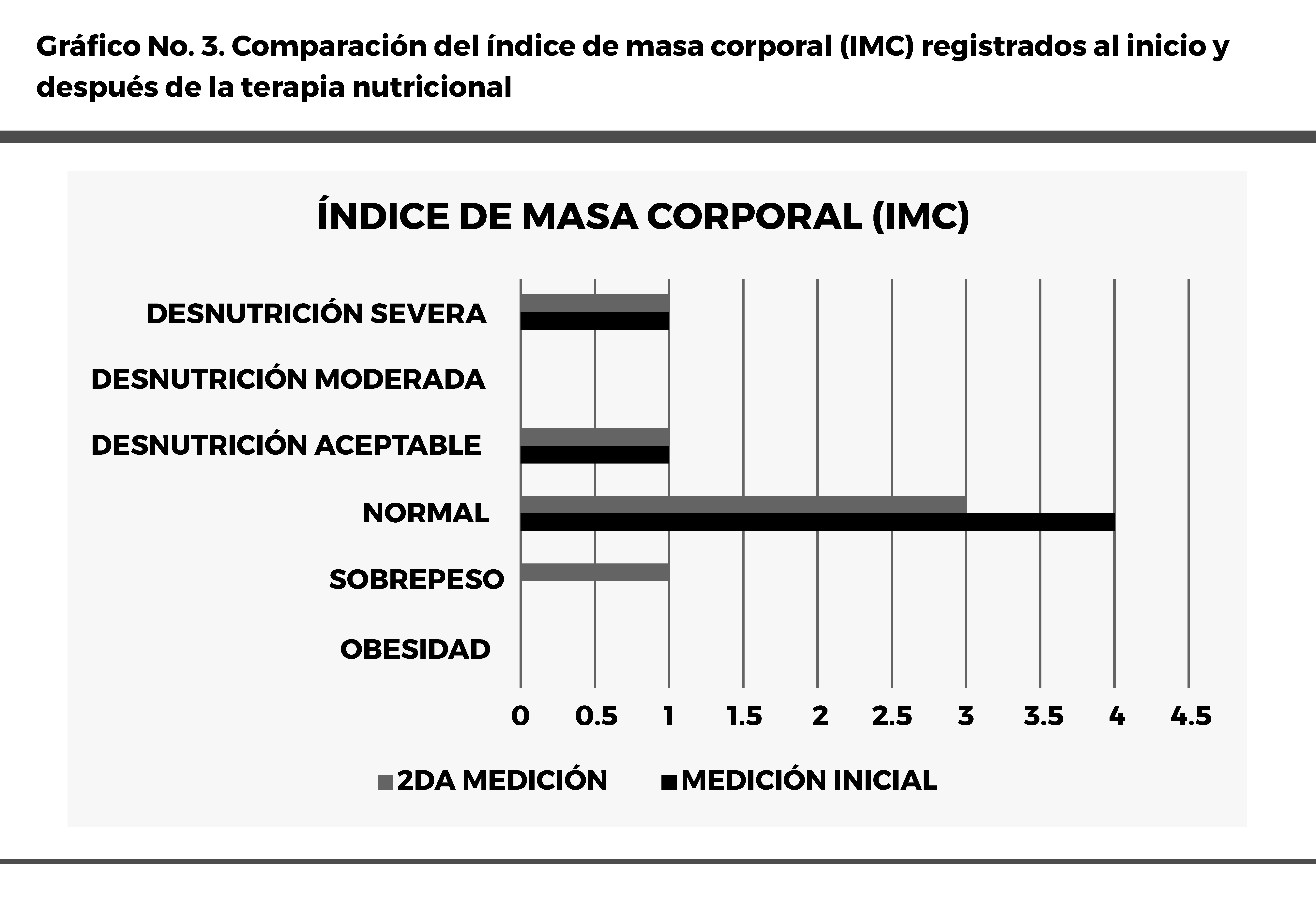 del estado nutricional normal, con una frecuencia de cuatro pacientes, mientras que el resto se distribuía entre desnutrición aceptable y desnutrición severa, sin registros en las categorías de sobrepeso u obesidad. Sin embargo, en la segunda medición se observa un leve desplazamiento en la distribución de categorías: la cantidad de pacientes con IMC normal se redujo, y se registró un aumento en la categoría de sobrepeso. Este comportamiento sugiere que algunos pacientes experimentaron fluctuaciones leves en su peso corporal que modificaron su clasificación de IMC, posiblemente como resultado de la intervención nutricional hospitalaria. En particular, el descenso en la frecuencia de desnutrición severa y el incremento de casos en la categoría de sobrepeso pueden interpretarse como indicios de recuperación ponderal en algunos pacientes, aunque no necesariamente implica exceso de peso, sino una mejoría desde rangos inferiores.
