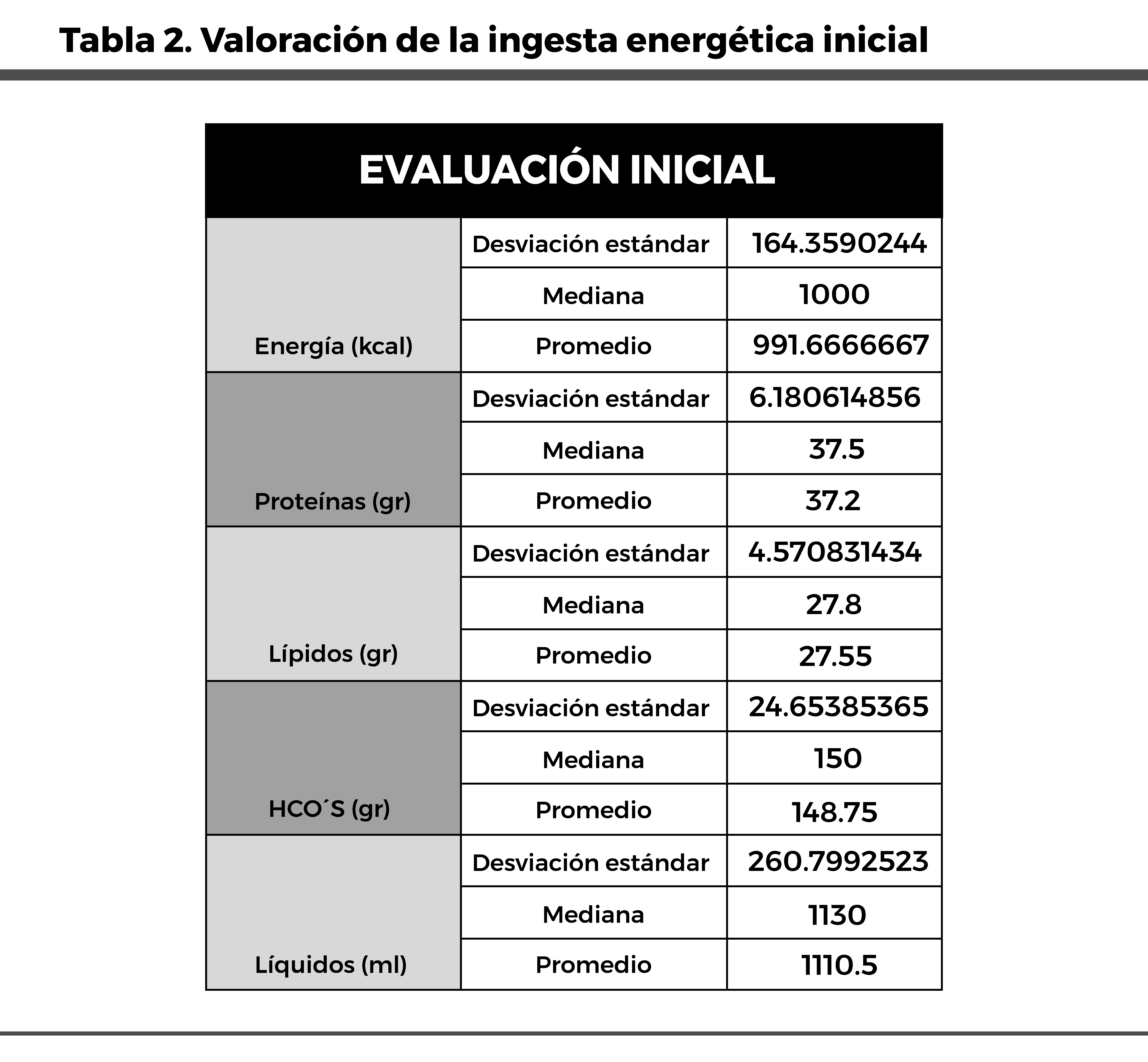 Nota: La tabla presenta los valores promedio, mediana y desviación estándar de la ingesta dietética inicial de los pacientes hospitalizados. Kcal (calorías), Gr (gramos), Ml (mililitros). Elaboración propia.