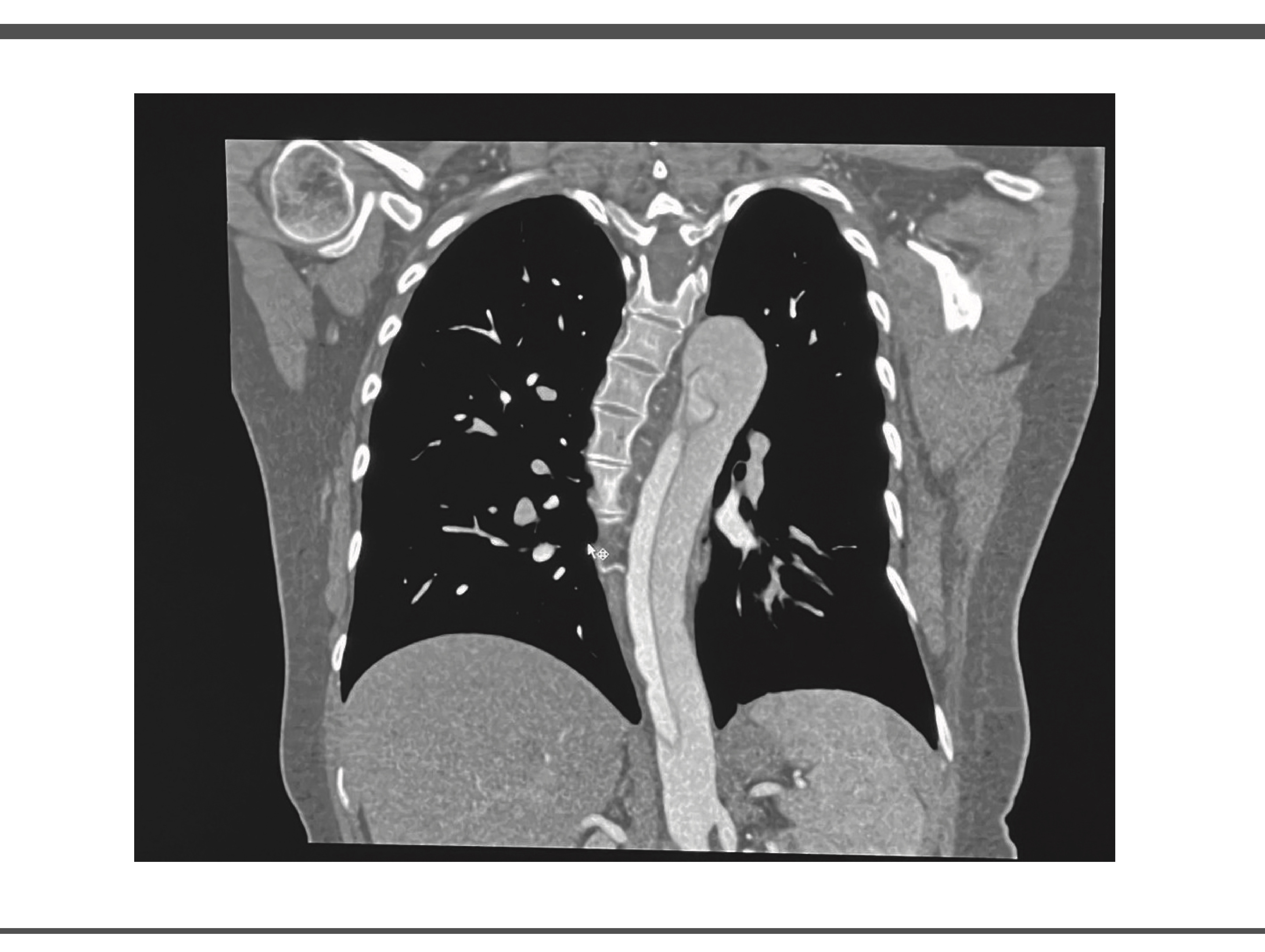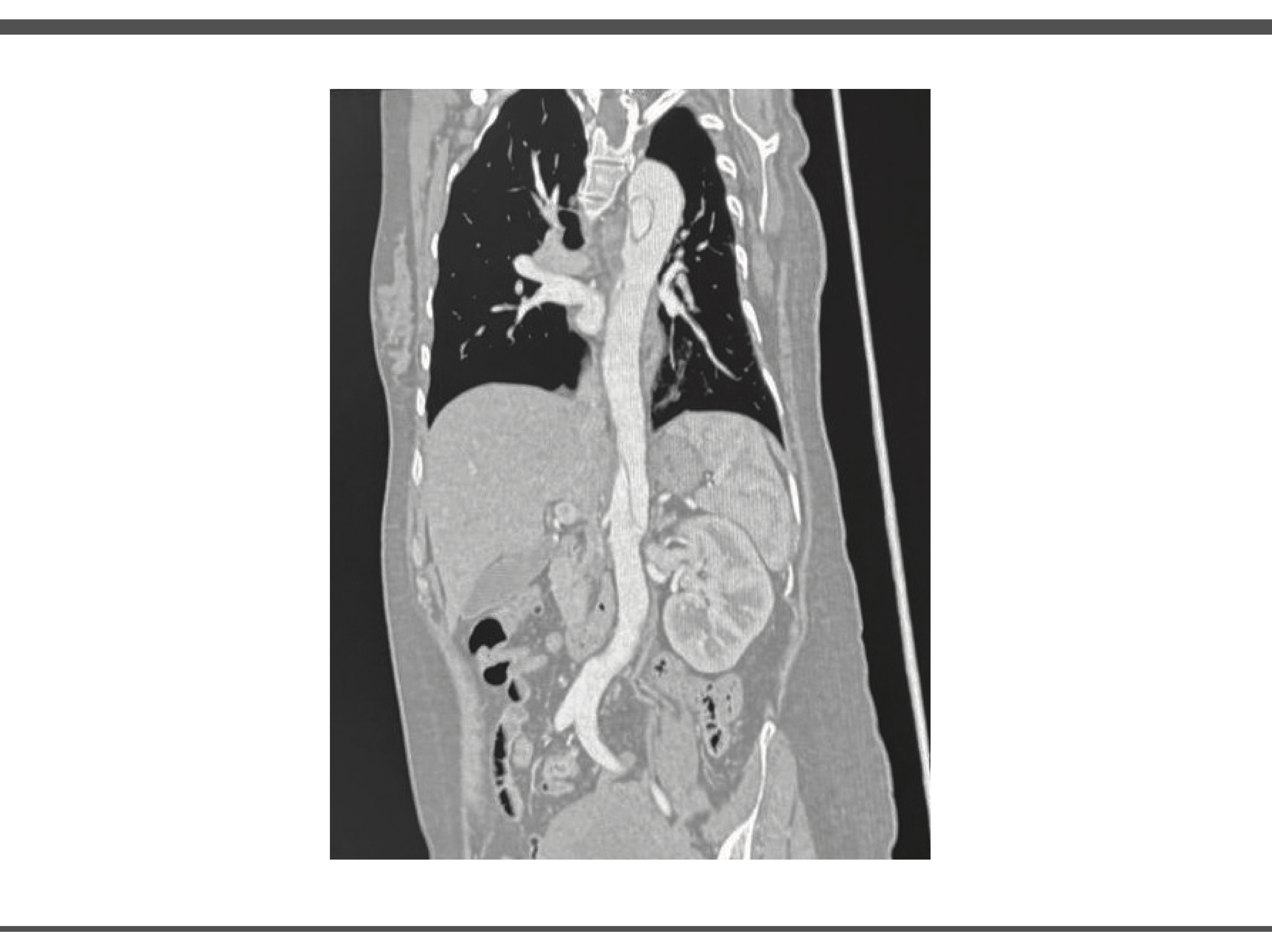 Durante su estancia en UCI se realiza angiotomografia en donde se obtienen imágenes compatibles con disección aortica, así como valoración por el servicio de angiología y cirugía vascular en donde se observó arco aórtico tipo II, con disección inmediatamente posterior a ostium de arteria subclavia izquierda, con extensión observable en ultimo corte en la aorta infrarenal con ramas viscerales dependientes de luz verdadera, por lo que la paciente es candidata a exclusión endovascular de segmento torácico y viscerales, pero debido a ausencia de insumos endovasculares y capacidad resolutiva, no es posible realizar este procedimiento en nuestro hospital. (Ilustración 2 y 3)