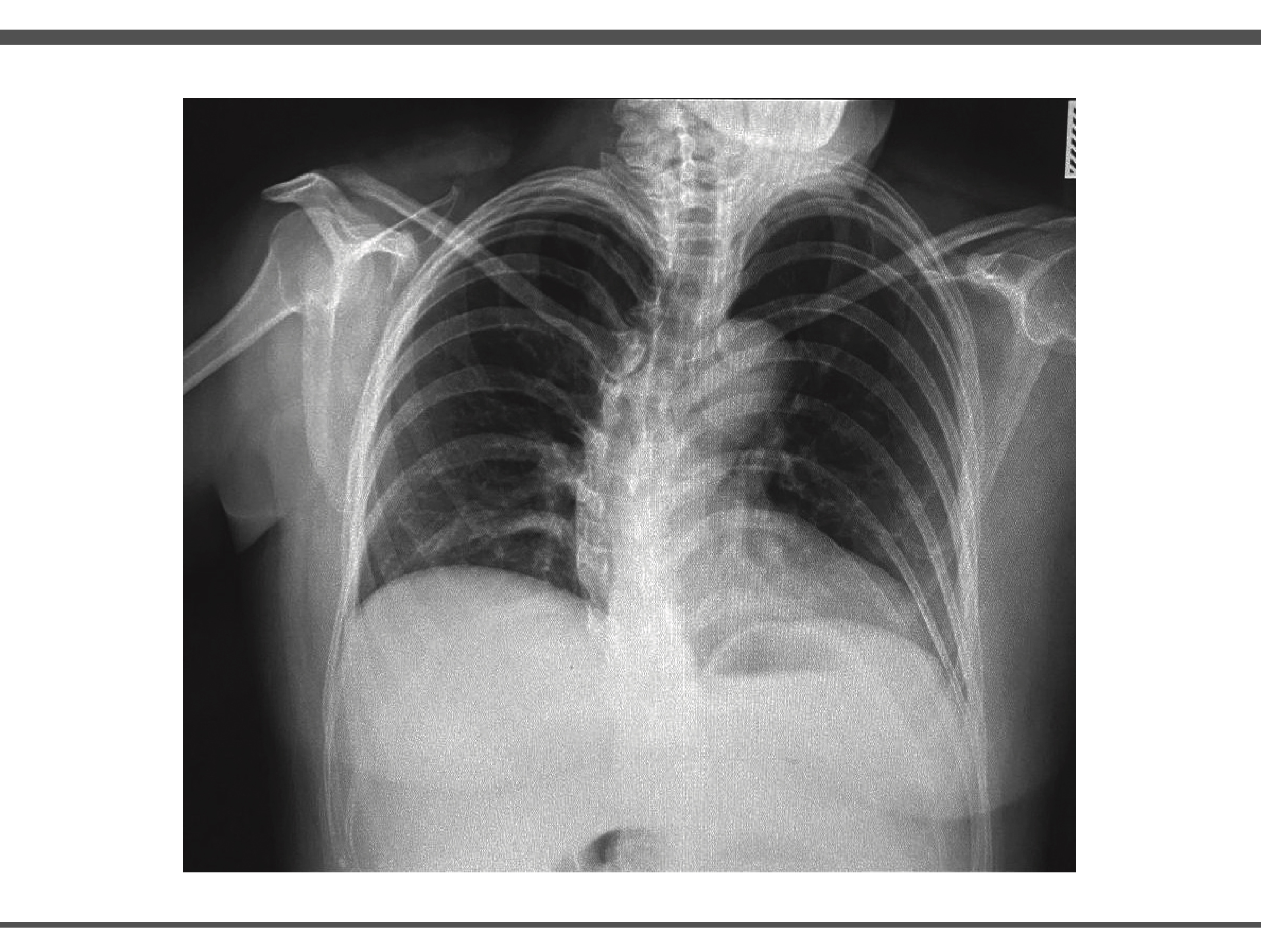 Se realizó electrocardiograma de 12 derivaciones en donde se observa un ritmo sinusal con frecuencia de 81 latidos por minuto, con eje positivo a la derecha con ondas 2 mV T negativas en V1 y V2, sin alteraciones en la conducción ni bloqueos de rama, así mismo se realiza una radiografía de tórax posteroanterior con rotación a la izquierda, en las estructuras óseas se observa desviación dextroconvexa de la columna dorsal y botón aórtico aparentemente aumentado de tamaño, campos pulmonares con adecuada radiopacidad, sin infiltraciones ni ocupaciones anormales ni engrosamientos pleurales, sin presencia de neumotórax (motivo de referencia), (Imagen 1).